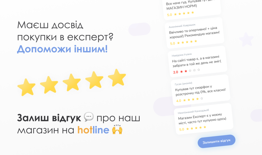 Ми з командою «Експерт» працюємо на благо України. Тому небайдужі до допомоги фондам, які підтримують онкохворих дітей чи ЗСУ. Кожна ваша покупка в Expert — це вклад в перемогу України, а також дитячі життя.