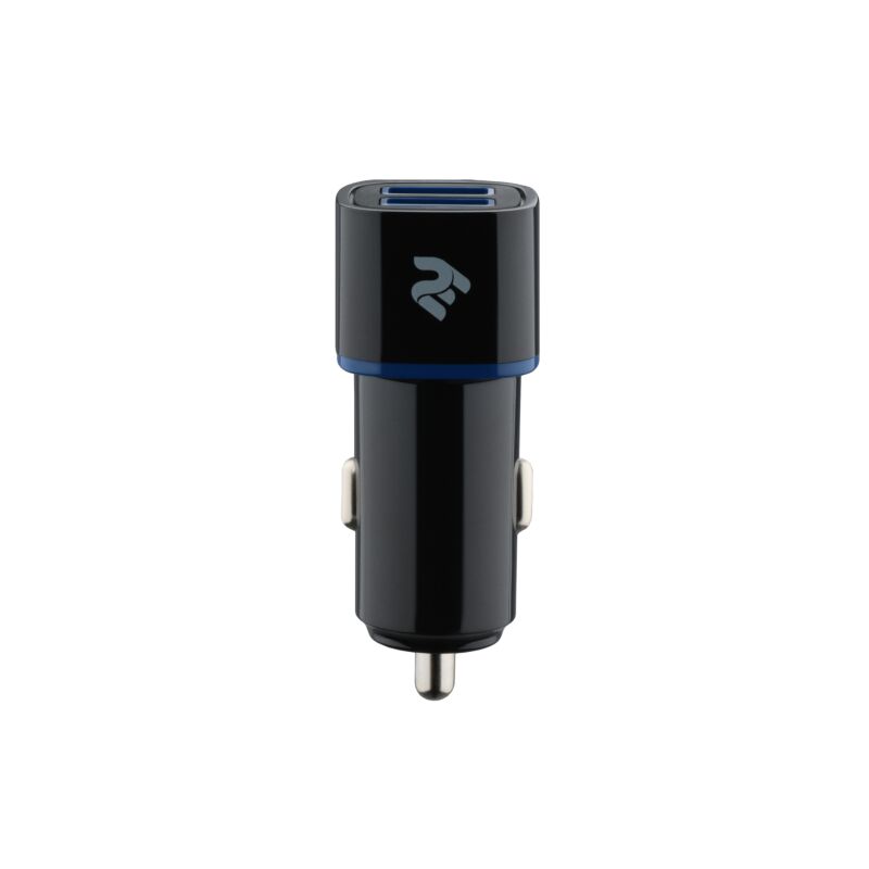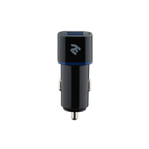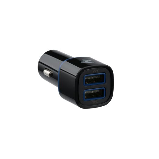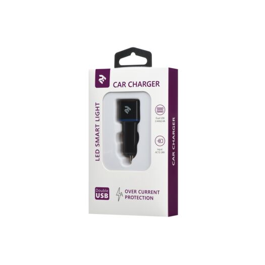 Універсальний автомобільний зарядний пристрій чорного кольору з двома портами USB та силою струму 2.4А на кожний рознім. Підходить для одночасної зарядки смартфона та планшета.