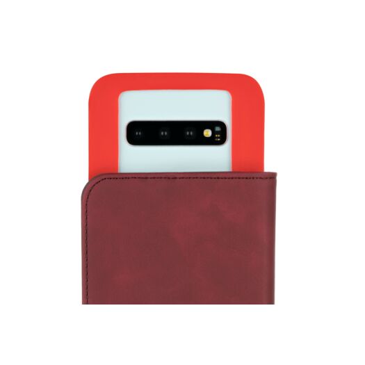 Зовні чохол виконаний з шовковистої матової PU шкіри, внутрішній шар з мікрофібри. Щільний силіконовий тримач для смартфона товщиною 2 мм стійкий до розтягування і щоденного зносу. Для зручного користування камерою є вбудований слайдер. Закритий чохол надійно фіксується магнітної застібкою. Чохол може бути використаний в режимі стенду для читання і перегляду відео.