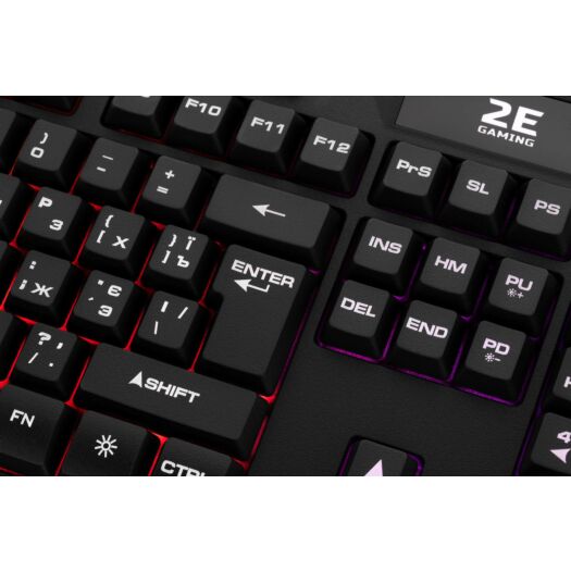 Мембранна повнорозмірна ігрова клавіатура 2E Gaming KG340 виконана в яскравому ігровому дизайні, що гарантує перевагу навіть у запеклішій безкомпромісній боротьбі.