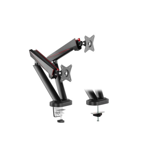 Підставка для двох моніторів чорного кольору з червоними вставками. Дизайн продовжує кіберспортивний дух 2E Gaming – тож запекла битва у грі чи просто ефективне виконання робочих завдань точно будуть під контролем!