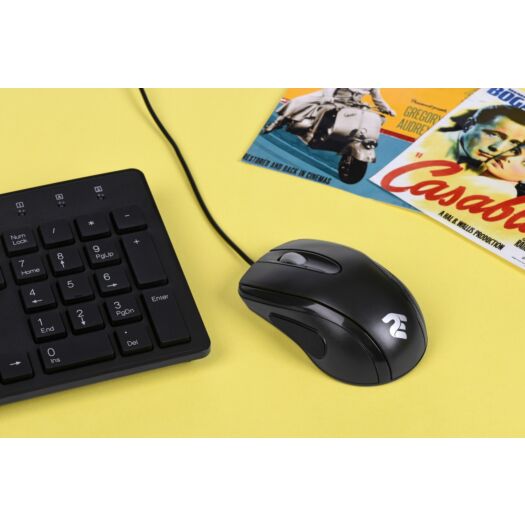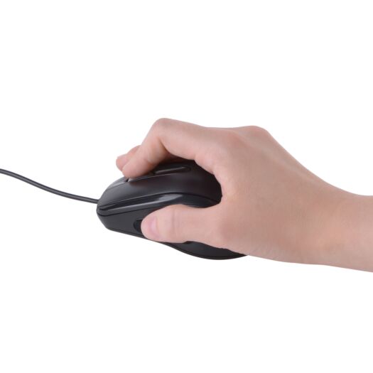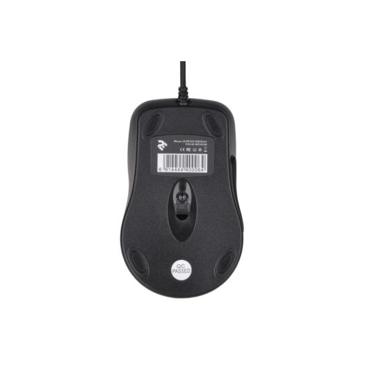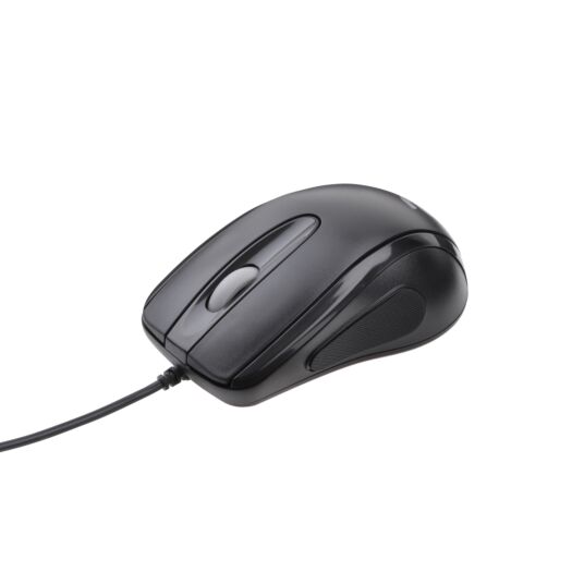 Компактна дротова миша з матовою поверхнею, прогумованою вставкою та симетричною формою корпусу.