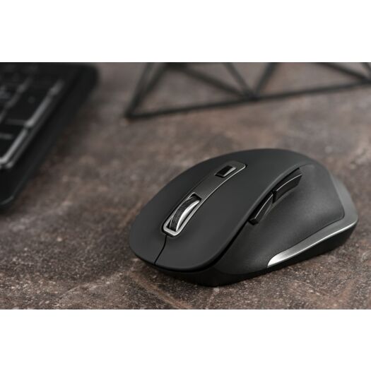 Повнорозмірна бездротова миша анатомічної форми, розроблена для комфортної роботи протягом тривалого часу. Підставка під великий палець з прогумованою вставкою, приємне на дотик Soft-touch покриття та форма миші роблять її максимально зручною. Шість додаткових функціональних кнопок, можливість зміни чутливості з 800 до 2400 DPI, допоможуть максимально ефективно користуватися мишею в різних робочих процесах – від пошуку в інтернеті, до роботи у графічних редакторах. Доповняють загальне враження - стильний дизайн з декоративними срібними елементами.