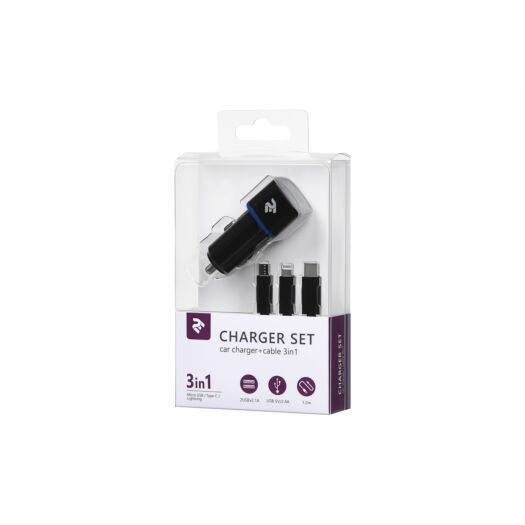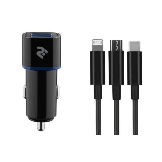 2E Набір Автомобільний ЗП 2хUSB 2.4A + кабель 3в1 Lightning/microUSB/Type-C) Black