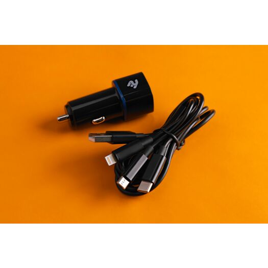 Комплект складається з автомобільного зарядного пристрою з двома портами USB 2.0 та кабелю-розгалужувача з коннекторами Lightning/microUSB/Type-C. Кабель призначений для підзарядки та синхронізації мобільних пристроїв.