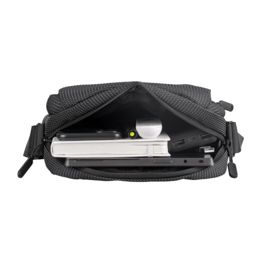 Сумка 2E Network 10 - повсякденна компактна і одночасно містка вертикальна сумка для молоді, з відділенням для планшета до 10". Має чорний колір, з білими точковими вкрапленнями. У сумці досить внутрішнього простору, а ще вона неймовірно зручна й добре скомпонована.