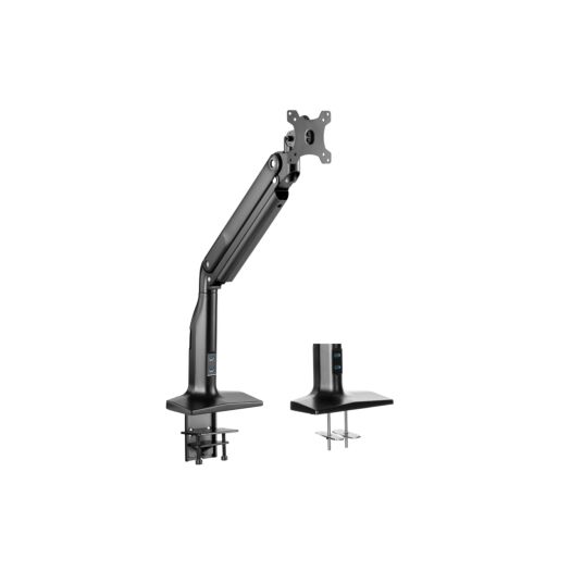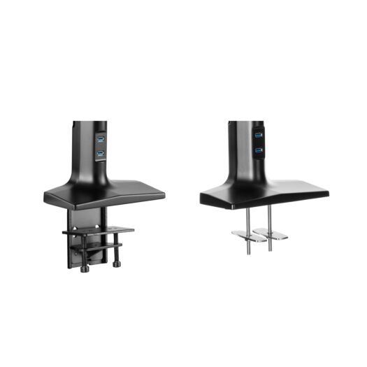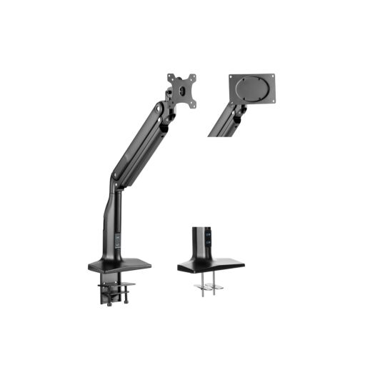 Підставка для монітора з вбудованим USB-хабом на два порти стандарту 3.0. Кронштейн має надзвичайно зручне й оптимальне кріплення та не займає багато простору на робочій поверхні. За допомогою системи прокладання кабелю всі дроти можна зібрати разом. Підставка підходить для моніторів із діагоналлю від 17″ до 43″ і витримує навантаження до 18 кг. Завдяки спеціальному пружинному механізму з регулюванням, можна самостійно налаштовувати оптимальну позицію – нахил/поворот/обертання.
