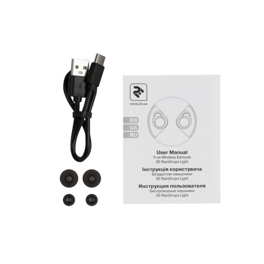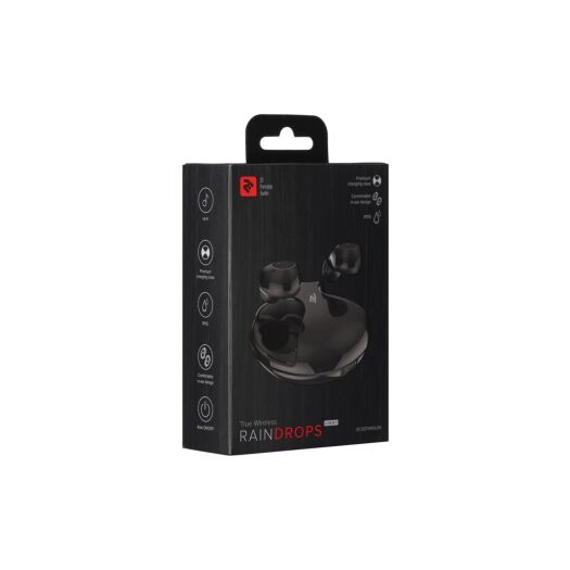 Повністю бездротові навушники з кейсом для підзарядки, мікрофоном та вологозахистом IPX5. Для підключення використовується Bluetooth 5.0. Час автономної роботи навушників становить 5 годин, а загальна робота з кейсом становить до 20 годин. Магнітна фіксація дозволяє легко помістити вкладиші в кейс, а при вилученні відбувається автоматичне з’єднання навушників з пристроєм. 2E RainDrops укомплектовані силіконовими амбушурами трьох розмірів і кабелем USB Type-C для зарядки кейса.
