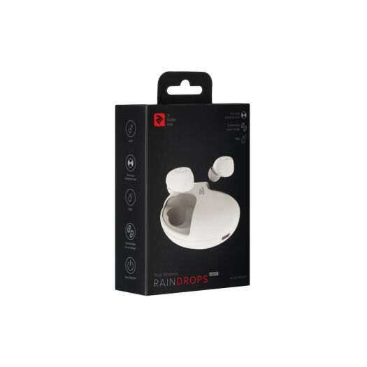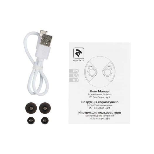 Повністю бездротові навушники з кейсом для підзарядки, мікрофоном та вологозахистом IPX5. Для підключення використовується Bluetooth 5.0. Час автономної роботи навушників становить 5 годин, а загальна робота з кейсом становить до 20 годин. Магнітна фіксація дозволяє легко помістити вкладиші в кейс, а при вилученні відбувається автоматичне з’єднання навушників з пристроєм. 2E RainDrops укомплектовані силіконовими амбушурами трьох розмірів і кабелем USB Type-C для зарядки кейса.