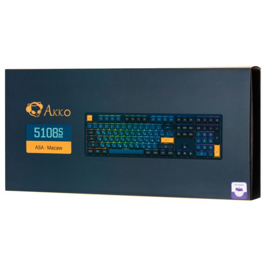 Механічна ігрова клавіатура Akko 5108 Macaw є продовженням серії периферії Akko, присвяченої яскравому сімейству папуг Ара (англ. Macaw). Це повнорозмірна дротова клавіатура, що вирізняється контрастним дизайном завдяки поєднанню синього та жовтого кольорів, притаманних тропічним птахам.