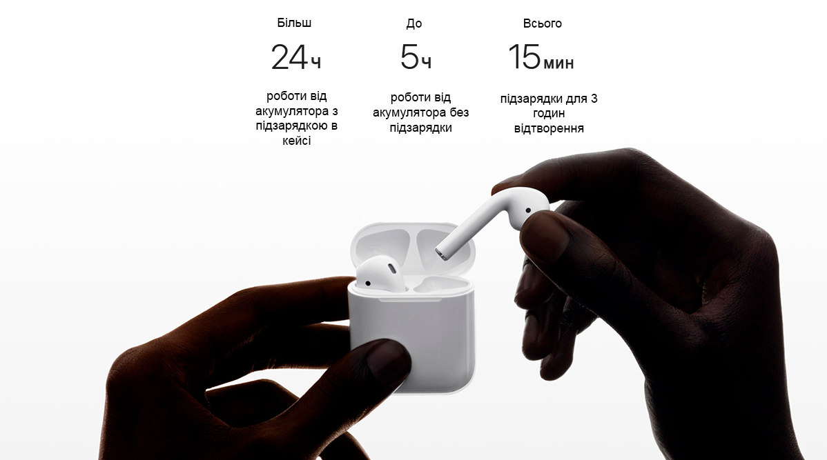 Apple AirPods 2 - визнаний лідер по тривалості звучання. На одному заряді навушники відтворюють музику до 5 годин і до 3 годин функціонують в режимі розмови. Щоб не переривати музичний супровід, скористайтеся зарядом футляра, якого вистачить на кілька циклів. В цілому ви можете розраховувати на більш ніж 24 години роботи гарнітури. Всього 15 хвилин підзарядки, і ваші AirPods 2 забезпечать ще три години відтворення і до двох годин розмов. Хочете знати, скільки заряду залишилося? Запитайте у Siri.