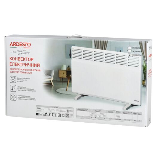Електричний конвектор з тижневим програматором, електронним керуванням, класом захисту IP24 і потужністю 2000 Вт. Розрахований на обігрів 20 м2. Конвектори Ardesto підтримують два типи монтажу – настінний і підлоговий. Кронштейни та опори поставляються в комплекті з обігрівачем.