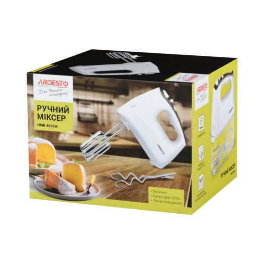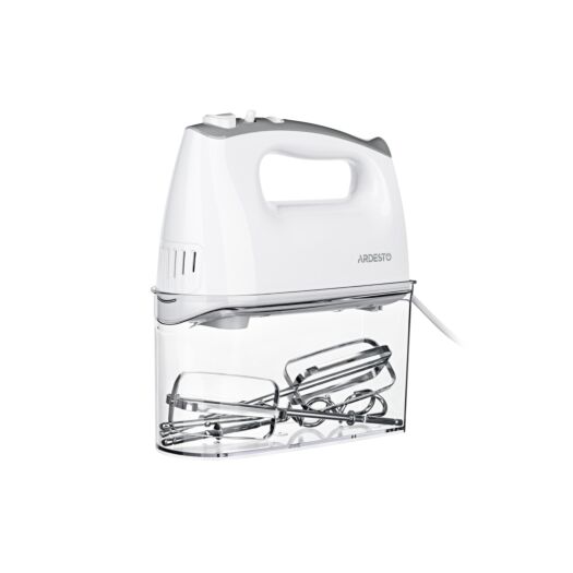 Ручний міксер для збивання інгредієнтів та швидкого замісу тіста. Для зручного зберігання насадок передбачено спеціальний контейнер.