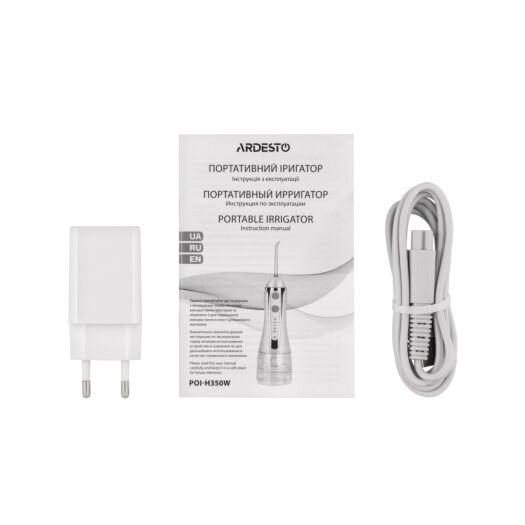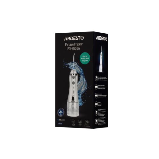 Сучасний портативний іригатор ARDESTO POI-H350W призначений для підтримання гігієни ротової порожнини. Має п’ять режимів тиску: низький, середній, високий, пульсуючий, а також масаж ясен. У комплектації 7 насадок: дві класичні; ортодонтична насадка (для чищення зубів із брекетами, імплантами та протезами); парадонтологічна насадка; насадка-щітка; насадка для чищення язика; насадка для зволоження носа. Також у наборі є ємність для води 300 мл і чохол для зручного транспортування. Рекомендована стоматологами частота пульсації становить 1 200 – 1 400 р/хв. Пристрій має вбудований акумулятор на 2 500 мА·год, що забезпечує до 7 днів автономної роботи.