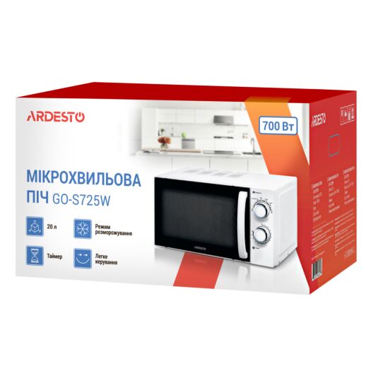 ARDESTO Мікрохвильова піч, 20л, мех.управл., 700Вт, відкр.ручкою, білий