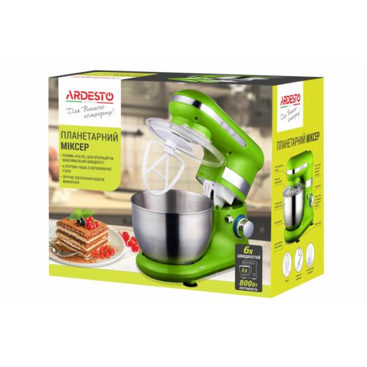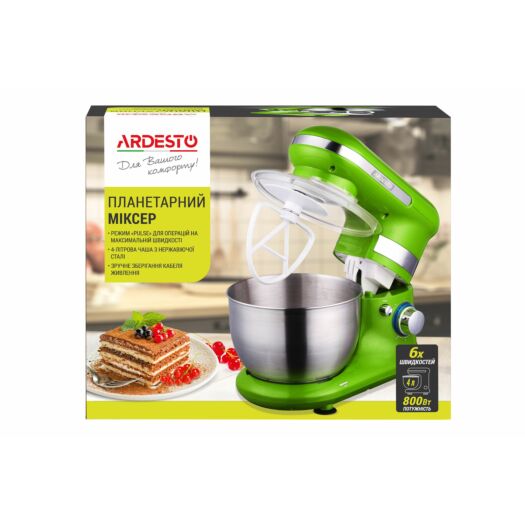 Планетарний міксер для збивання великої кількості інгредієнтів та швидкого замісу тіста. У комплект постачання входить чаша з кришкою, а також насадки трьох типів.