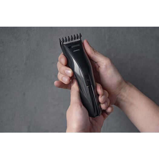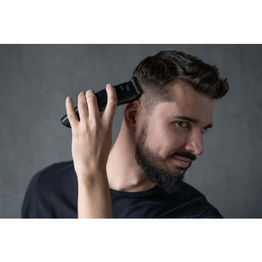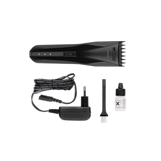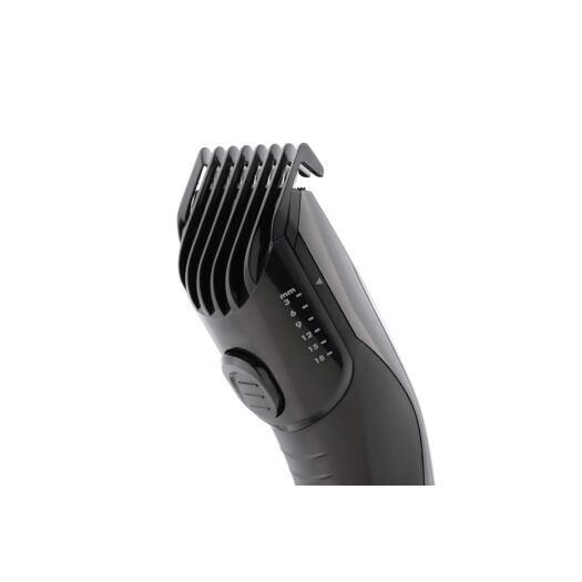 Компактна машинка чорного кольору для підстригання волосся з вбудованим акумулятором, LED-індикацією заряду та знімною насадкою з регулюванням довжини від 3 до 18 мм. У машинці використовуються сталеві леза, а знімна насадка отримала зручну кнопку для регулювання довжини підстригання – від 3 до 18 мм. Без насадки, мінімальна довжина підстригання – 1 мм, а для досягнення натурального ефекту, є вбудована насадка для філірування. Вбудований акумулятор забезпечує 45 хвилин автономної роботи, а час повної зарядки складає 90 хвилин. Для зручності передбачено LED-індикацію заряду.