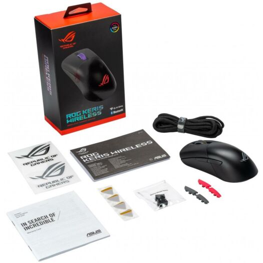Ігрова миша ASUS ROG Keris Wireless відрізняється трьохрежимним підключенням (USB-кабель, 2,4 ГГц, Bluetooth), спеціально налаштованим датчиком ROG з дозволом 16000 точок на дюйм, а також оригінальними роз'ємами для перемикачів.