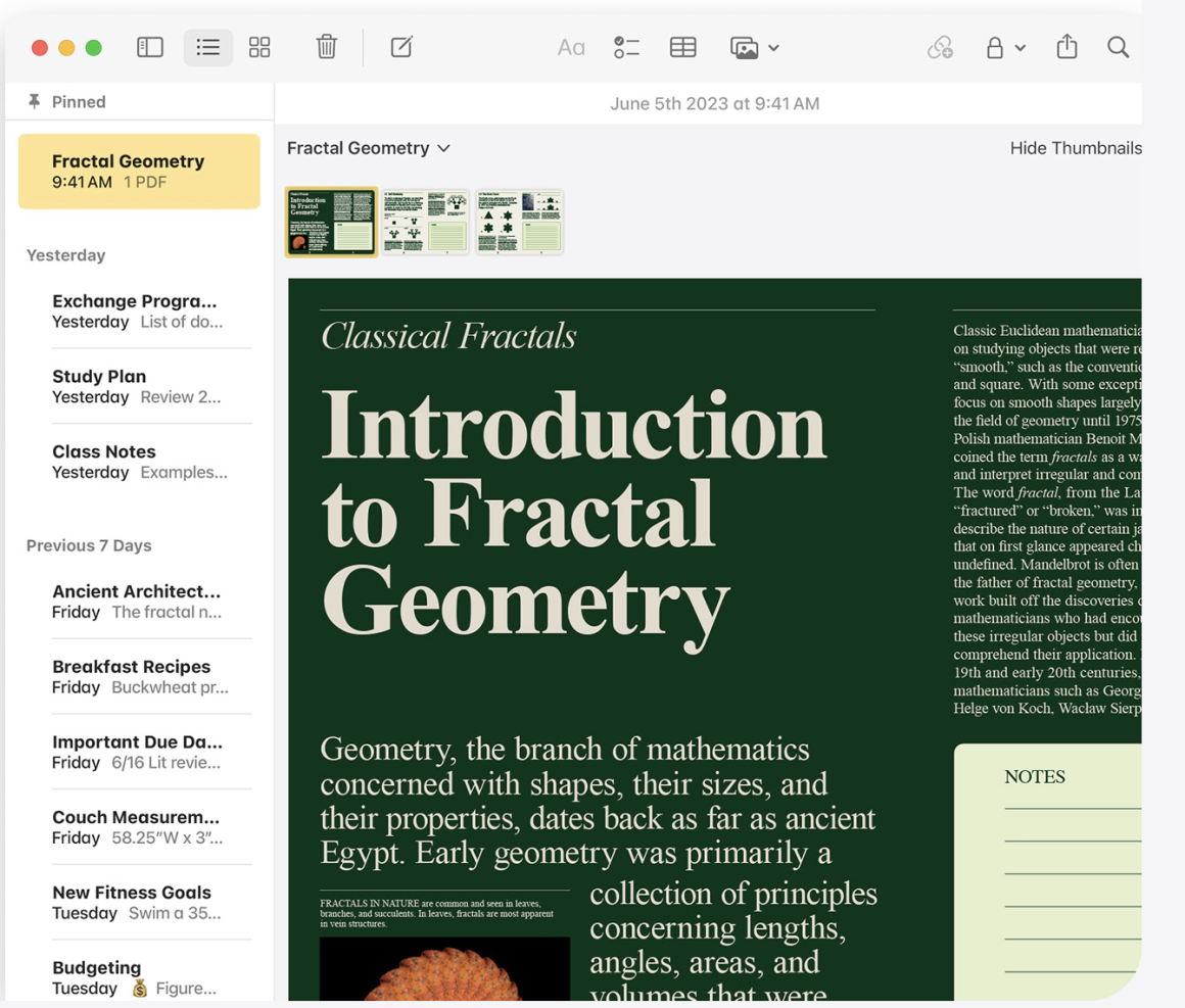 Перегляд PDF-файлів у програмі "Нотатки" в Sonoma спрощено. Насолоджуйтеся безперервним повноекранним переглядом PDF-файлів в інтерфейсі Нотаток зі зручною навігацією між сторінками. Ця функція підвищує продуктивність, дозволяючи зберігати кілька PDF-файлів в одній нотатці для швидкого доступу до важливих документів.