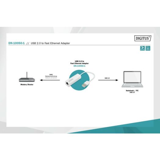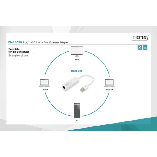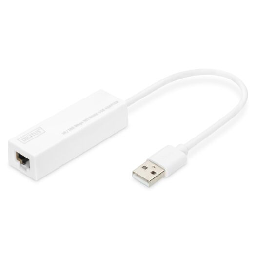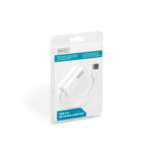Адаптер DIGITUS USB 2.0 – 10/100 Mbps Ethernet. Швидкість 10/100 Мбіт/с підтримується на роз'ємі LAN. Сумісність з Ethernet IEEE 802.3 та 802.3u (10Base-T, 100Base-TX) з автоузгодженням. Підтримує повну швидкість USB 2.0 та високу швидкість (живлення від шини USB).