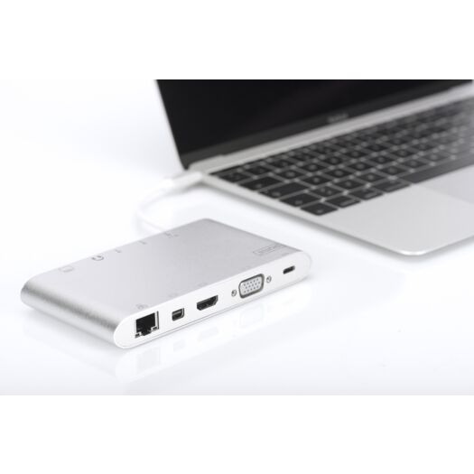 Повнофункціональна універсальна док-станція від Digitus з портом USB Type-C ™ забезпечує всі можливості для створення повністю обладнаного робочого місця. Три відеоінтерфейси (HDMI, Mini DP, VGA) дозволяють одночасного використовувати два монітори. Підтримка максимально можливого дозволу: стандарт UHD з чудовою якістю зображення (4K2K /30 Гц). Наявність трьох портів USB 3.0, один з портів (5 В/1,5 А) додатково забезпечує можливість зарядки мобільних пристроїв. Порт USB Type C з функцією подачі електроживлення Power Delivery (PD 2.0) доповнює функціональність інтерфейсів USB. Також вбудовані два пристрої зчитування карт (MicroSD, SDHC, SDXC/MMC). Порт Gigabit Ethernet також забезпечує можливість підключення вашого ноутбука до мережі за допомогою кабелю. Наявність аудіороз'єму робить систему комплексної. Багатофункціональна універсальна док-станція з портом USB Type-C дозволить оснастити ваш ноутбук 11 додатковими роз'ємами всього лише через один порт USB Type-C ™.