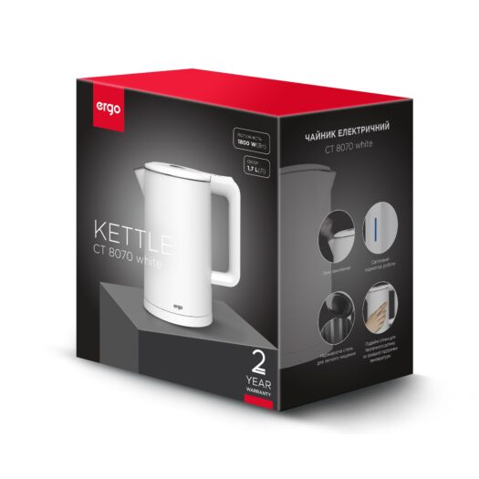 За допомогою нагрівального елемента у формі закритого диска вода в чайнику закипає за лічені хвилини. Ергономічна конструкція приладу дає змогу легко очищати його від накипу та забруднень. Потужність, якість і довговічність Електрочайник ERGO CT 8070 WHITE має світловий індикатор живлення й індикатор рівня води, кнопку вмикання/вимикання, зручну ручку та відкидну кришку. Потужність аксесуара 1800 Вт. Він має міцний корпус і абсолютно безпечний у використанні, а двомадична гарантія — свідчення довговічності та надійності.
