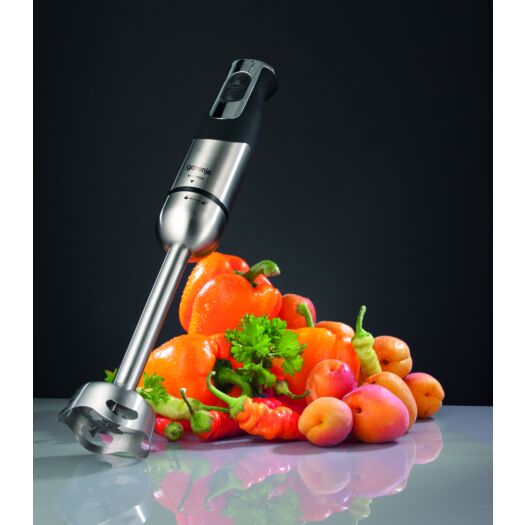 З підставкою блендер ніколи не буде заважати на кухонному столі. Вона організовує зберігання насадок і тримає їх завжди під рукою. Надійний потужний мотор вас не підведе. Він заощадить електроенергію і прослужить довго. Зручна рукоятка з м'яким приємним покриттям софт-тач оснащена кнопками включення і турборежима, який миттєво збільшує потужність роботи. Інноваційна форма ножа з чотирма лезами з нержавіючої сталі дозволяє швидко і ретельно перемішувати, подрібнювати і змішувати інгредієнти. За допомогою додаткових насадок погружний блендер перетворюється в універсального кухонного помічника.