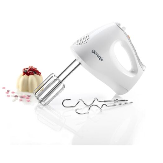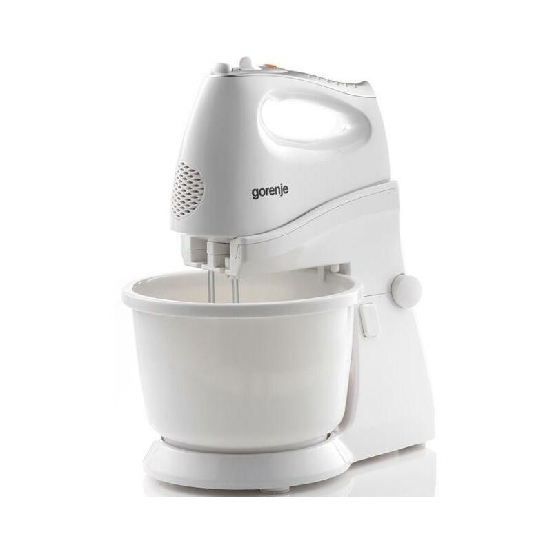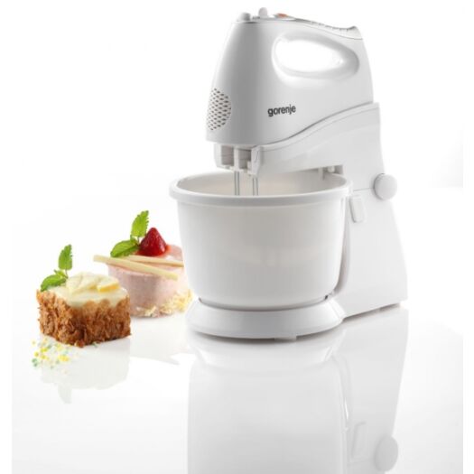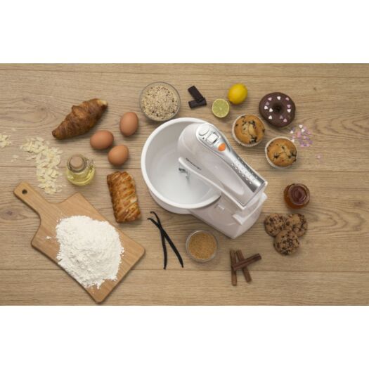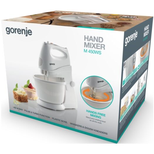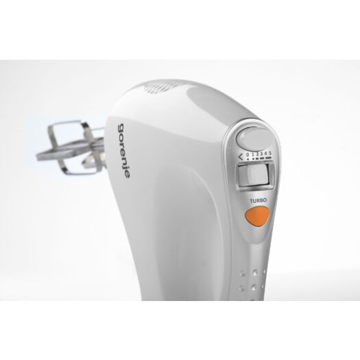 Міксер потужністю 450 Вт має 5 швидкостей. На панелі управління у верхній частині міксера знаходиться перемикач для включення і виключення, кнопки вибору швидкісного режиму і включення імпульсного режиму і кнопка виймання насадок. Насадки міксера і чашу можна мити в посудомийній машині.