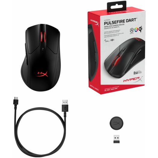 HyperX Pulsefire Dart - це геймерська бездротова миша з надійним RF-підключенням на частоті 2,4 ГГц, яка змусить вас жалкувати, що так довго не могли відмовитися від проводів. Бездротовий адаптер розширює радіус охоплення для настільних систем ПК. Пристрій має маркування Qi для бездротової зарядки і може працювати до 50 годин без заряджання.