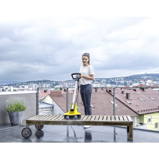 Апарат для чищення терас PCL 4 ретельно та рівномірно справляється із забрудненнями завдяки роликовим щіткам, які обертаються та вбудованій подачі води. Просто підключіть його до шлангу для води.