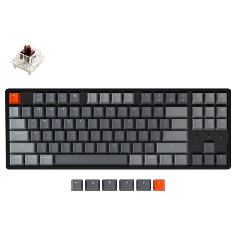 Keychron K8 Бездротова механічна клавіатура Tenkeyless включає ковпачки для клавіш як для Windows, так і для macOS, а за допомогою версії з можливістю гарячої заміни користувачі можуть перемикати кожен перемикач за секунди.