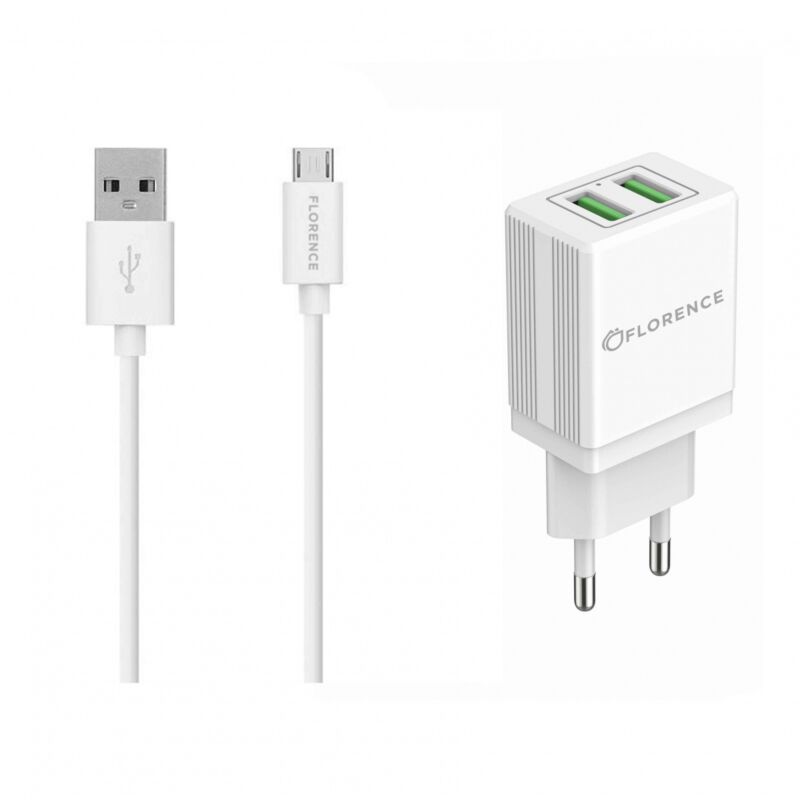 Мережевий зарядний пристрій Florence 2USB 2A + microUSB White (FL-1021-WM)