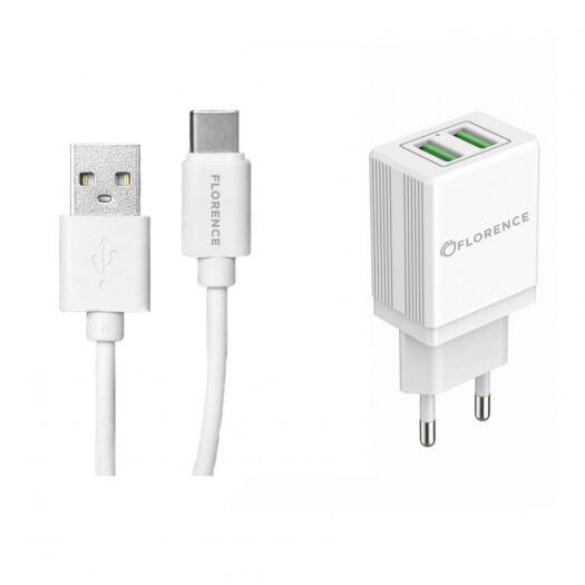 ОписМережевий зарядний пристрій Florence 2USB 2A + Type-C White (FL-1021-WT)