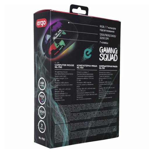 Оптична миша ERGO NL-750 обладнана мультимедійними клавішами «Вперед» і «Назад», які полегшують процеси гри, а також зручним прогумованим колесом прокрутки. Кнопки витримують більше 3 мільйонів натискань. За допомогою клавіші перемикання DPI (1200/1600/2400/3200) маніпулятор відмінно проявляє себе під час гри.