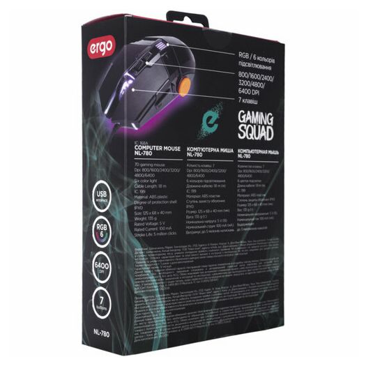 Маніпулятор ERGO NL-780 обладнаний кнопками «Вперед» і «Назад», які полегшують процес гри, а також прогумованим широким колесом прокрутки. Здвоєний перемикач DPI (800/1600/2400/3200/4800/6400) дозволяє налаштувати мишку для швидшого реагування або чіткого влучення в ціль під час віртуальних боїв.