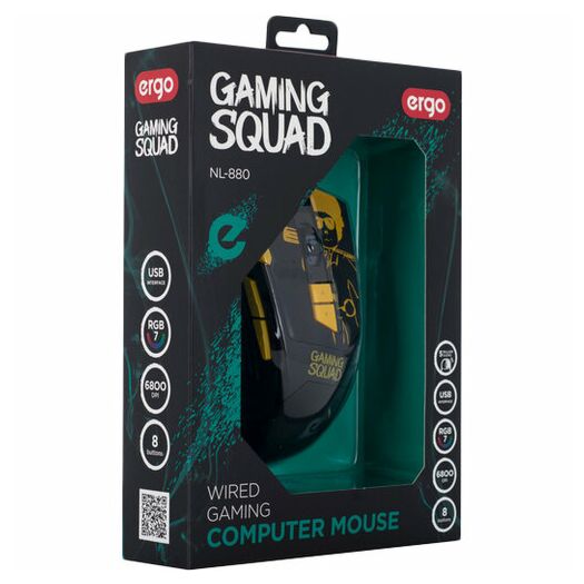 Міцний корпус ERGO NL-880 виготовлений з ABS-пластику зі спеціальним покриттям, яке запобігає ковзанню руки. Симетрична конструкція гарантує зручну гру як правцям, так і шульгам. «Розумне» LED-підсвічування полегшує використання основних ігрових функцій миші, адже кожен з 7 кольорів відповідає своєму режиму DPI: 1200 (red) / 1600 (green) / 2400 (blue) / 3200 (yellow) / 4800 (pink) / 5500 (sky-blue) / 6800 (white).