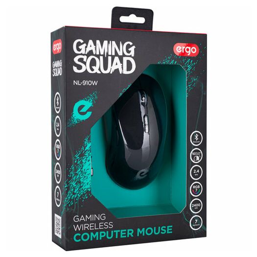 Мишка ERGO NL-910W оснащена чутливим сенсором і 7 клавішами: перемикачем DPI (2400), бічними кнопками «Вперед / Назад» і прогумованим колесом прокрутки. Семикольорове RGB-підсвічування, яким оснащений маніпулятор, не тільки робить техніку ефектним елементом інтер'єру; така функція дає можливість комфортно працювати ввечері або вночі. Маніпулятор підключається до ПК за допомогою USB-передавача і працює на відстані до 10 метрів.