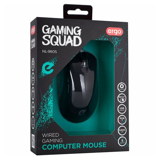 Мишка ERGO NL-960 S обладнана чутливим сенсором і 5 клавішами: перемикачем DPI (1000/1600/3200/6400), бічними кнопками «Вперед / Назад» і прогумованим колесом прокрутки. Семибарвне RGB-підсвічування, яким оснащений маніпулятор, не тільки робить техніку ефектним елементом інтер'єру; така функція дає можливість комфортно працювати у темному приміщені або вночі.