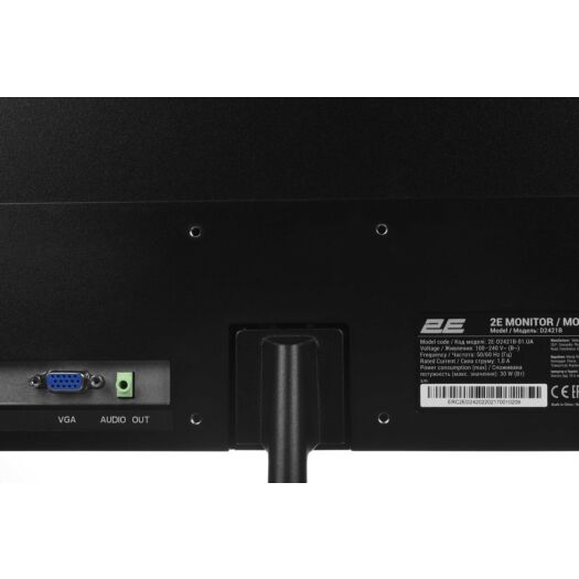 2E D2421B – універсальний монітор для ігор, роботи та розваг оснащено 23,8-дюймовою IPS-матрицею має роздільну здатність 1 920 × 1 080 і співвідношення сторін 16:9. Широкі кути огляду – 178°/178°, а нахилу екрана – 15°/5°. Ця модель має частоту оновлення 75 Гц, швидкість відгуку 5 мс, кількість кольорів становить 16,7 млн, контрастність на рівні 1 000:1, а яскравість – 300 кд/м². Із особливостей – Game plus, функція HDR, внутрішній блок живлення та навушники. Складнощів щодо під’єднання монітора як до сучасних ПК, так і до обладнання старшого зразка не виникне, адже пристрій оснащено інтерфейсами HDMI та D-Sub (VGA). Крім того, 2E D2421B можна монтувати на стіну завдяки кріпленню VESA 75.