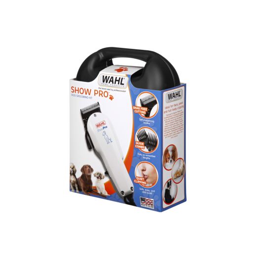 Машинка для стрижки животных WAHL Show Pro 09265-2016 оснащена самозатачивающимися лезвием с высоким содержанием углерода, долговечным и мощным мотором V5000 и 4 насадками для выбора различной длины стрижки (3, 10, 13, 25 мм).