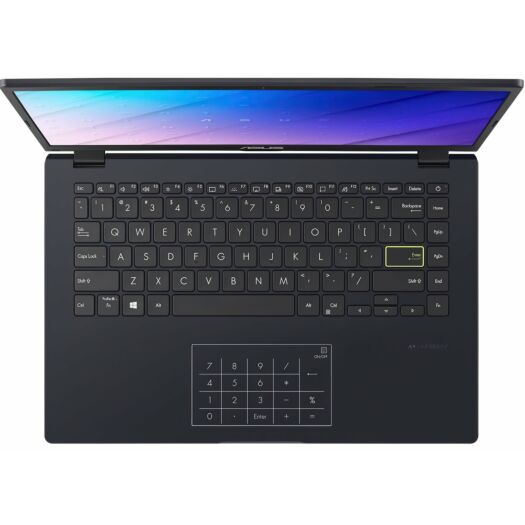 Ноутбук ASUS Laptop E410 виділяється зовні серед інших моделей своїм юнацьким запалом, який проявляється в деталях його оформлення: клавіші Enter, що виділяється яскраво-жовтим, і унікальному візерунку на кришці, що складається з елементів деконструйованого логотипа ASUS.