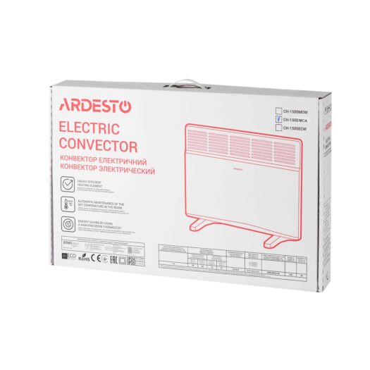 Ardesto CH-1500MCA використовує надійні комплектуючі – закритий обребрений нагрівальний елемент німецької компанії Eihenauer, а також італійський високоточний біметалічний термостат. Відсутність рухомих компонентів і продумана конструкція повністю виключає будь-які шуми при роботі. Механічне управління складається з клавіші вмикання із захисною накладкою та поворотного регулятора потужності. Конвектори Ardesto підтримують два типи монтажу – настінний і підлоговий. Кронштейни та опори поставляються в комплекті з обігрівачем.