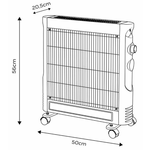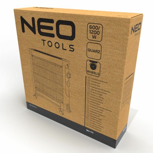 Працює від мережі 220-240 В, 50-60 Гц. Інфрачервоний обігрівач має хромовану решітку та коліщатка, що полегшує його переміщення. Довжина кабелю 1,3 м дозволяє легко підключити його до електромережі в будь-якому інтер'єрі. Цей економічний пристрій дає результати відразу після ввімкнення. Він економить енергію, використовуючи менше, ніж стандартний обігрівач. Він не перемішує повітря, що робить його придатним для алергіків. Гарантує безпеку завдяки вбудованому захисту від перегріву, перевантаження, короткого замикання та використанню вогнетривкого матеріалу. Кварцовий інфрачервоний обігрівач NEO рекомендується для опалення будинків, офісів, майстерень або дач.