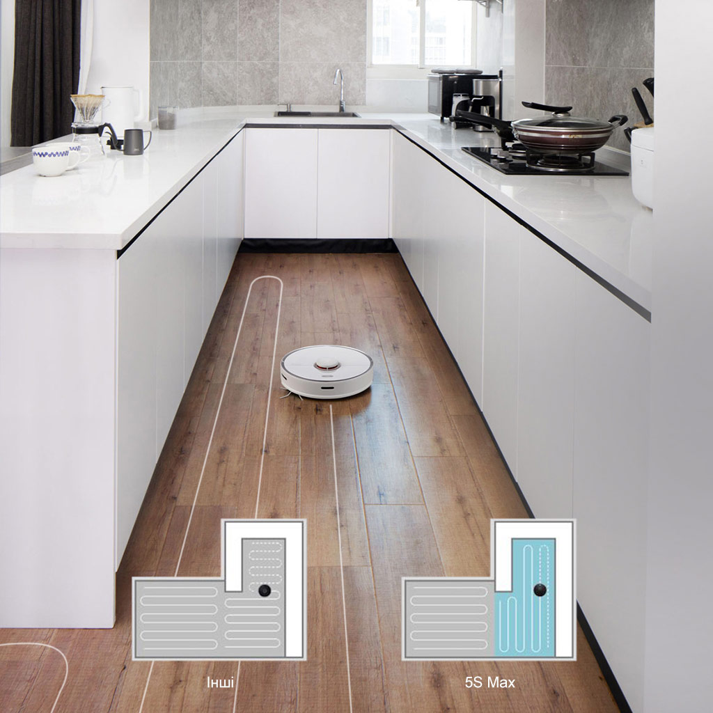 RoboRock S5 Max оснащений вдосконаленим LDS - датчиком, який сканує простір на 360 градусів, потужний 4-ядерний процесор обробляє інформацію і складає точні карти приміщення в реальному часі. Це допомагає пилососу ефективніше організувати робочий процес і будувати оптимальні маршрути з урахуванням всіх , щоб максимально якісно прибрати приміщення.