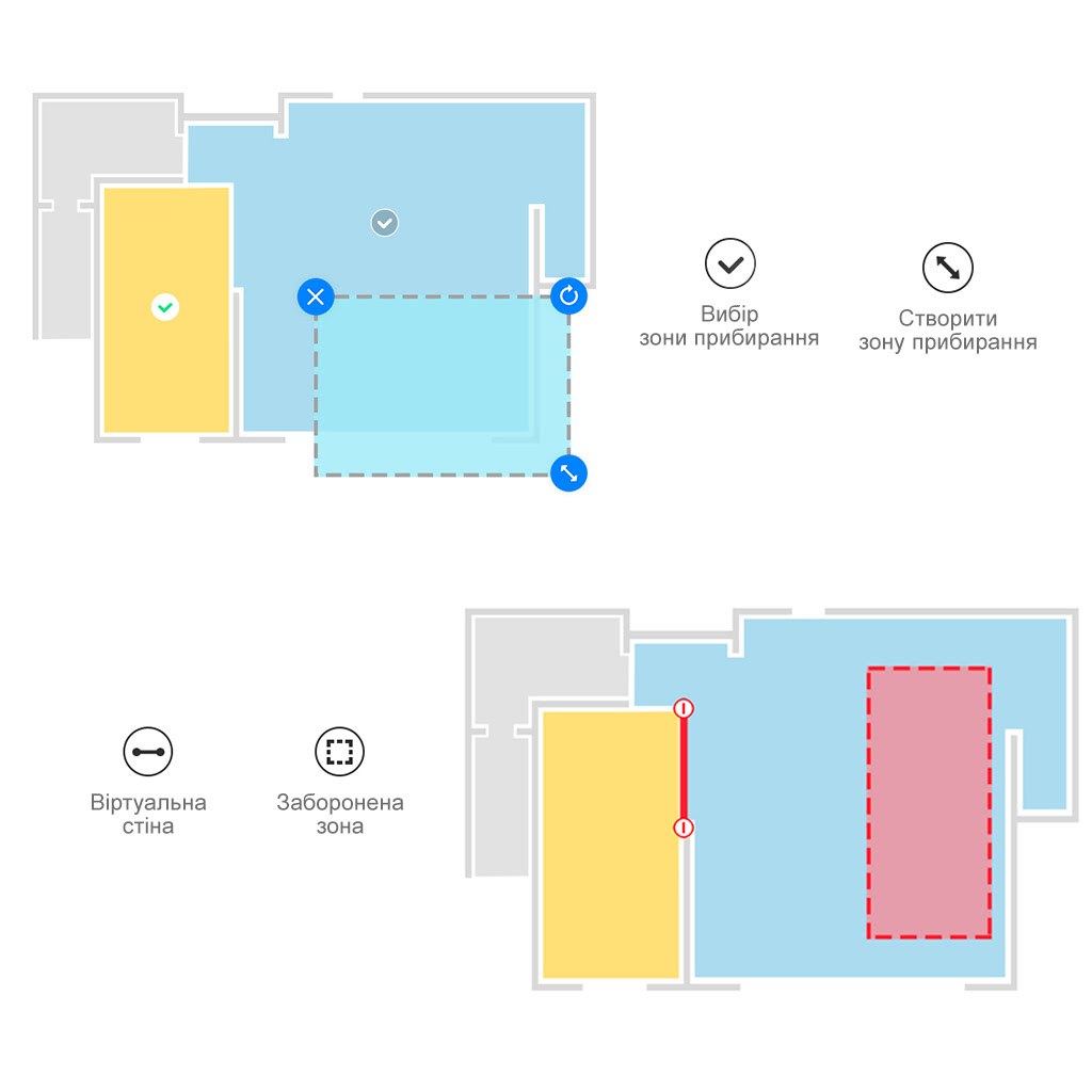 Ви зможете управляти роботою пилососа RoboRock S652 Vacuum Cleaner, використовуючи зручний фірмовий додаток на своєму смартфоні. Розділяйте приміщення на зони, встановлюйте віртуальну стіну, визначайте локальну зону прибирання. Ви зможете створювати графік прибирання і задавати час прибирання для кожної обраної зони.