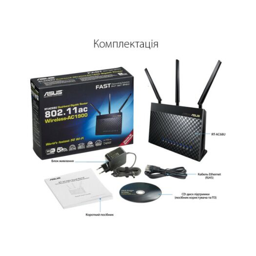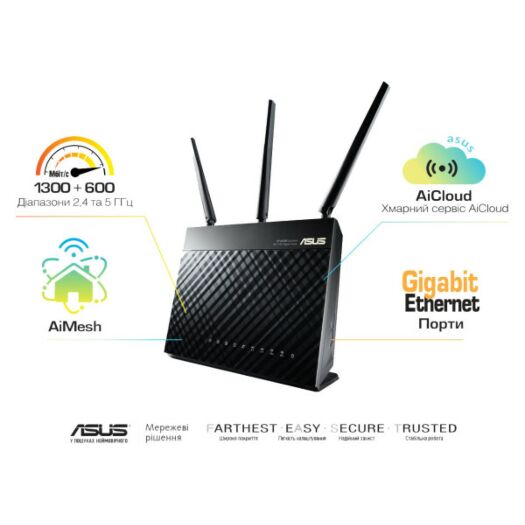 Для любителів високих швидкостей ASUS RT-AC68U - це бездротовий маршрутизатор стандарту 802.11ac, чия швидкість передачі даних в діапазоні 5 ГГц порівнянна з пропускною спроможністю проводового з'єднання Gigabit Ethernet. Крім того, завдяки технології Broadcom TurboQAM пропускна здатність інтерфейсу 802.11n в діапазоні 2,4 ГГц при роботі з сумісним мережевим обладнанням становить 600 Мбіт/с. За високу швидкість обробки переданих маршрутизатором даних відповідає двоядерний процесор, тому відтворення потокового HD-відео завжди буде плавним, «лаги» в онлайн-іграх - мінімальними, а якість звуку інтернет-телефонії - ідеальним. Завдяки роз'ємів USB 3.0 і USB 2.0 до маршрутизатора RT-AC68U можна підключити 3G/4G-модеми, принтери і зовнішні накопичувачі, щоб розширити функціональність пристрою. Наприклад, технологія ASUS AiCloud дозволяє перетворити підключений до RT-AC68U зовнішній жорсткий диск в хмарне сховище даних, до якого можна буде отримувати доступ віддалено з будь-якого комп'ютера, смартфона або планшета. Причому в режимі синхронізації маршрутизаторів AiCloud автоматично оновлює файли на зовнішніх накопичувачах, підключених до сумісних маршрутизаторів ASUS, до актуальних версій, таким чином полегшуючи обмін великими файлами. Для управління всіма функціями маршрутизатора служить зручний і інтуїтивно зрозумілий інтерфейс ASUSWRT. У число його можливостей входить моніторинг інтернет-трафіку і обмеження пропускної здатності інтернет-каналу для окремих додатків. Підтримка високошвидкісного стандарту Wi-Fi 802.11ac і технології TurboQAM ™ Загальна швидкість передачі даних маршрутизатора ASUS RT-AC68U складає 1900 Мбіт/с (1300 Мбіт/с в діапазоні 5 ГГц за стандартом 802.11ac і 600 Мбіт/с в діапазоні 2,4 ГГц за стандартом 802.11n з використанням технології TurboQAM ™), що робить цю модель найбільш високошвидкісною серед доступних на даний момент. Двоядерний процесор За високу швидкість обробки переданих маршрутизатором даних відповідає двоядерний процесор, тому відтворення потокового HD-відео завжди буде плавним, «лаги» в онлайн-іграх - мінімальними, а якість звуку інтернет-телефонії - ідеальним. Стабільна робота Технологія ASUS AiRadar служить для збільшення зони покриття мережі Wi-Fi. Інтелектуально визначаючи розташування підключених пристроїв, маршрутизатор перетворює слабкий всенаправленний сигнал в сильний односпрямований, що забезпечує більш високу швидкість передачі даних. Підтримка двох частотних діапазонів для бездротових мереж Завдяки можливості одночасної роботи в двох частотних діапазонах (2,4 і 5 ГГц) зі швидкістю 600 Мбіт/с і 1300 Мбіт/с, відповідно, RT-AC68U забезпечує загальну швидкість передачі даних по бездротовій мережі на рівні 1900 Мбіт/с. Інтерфейс USB RT-AC68U оснащується двома портами USB, один з яких відповідає новому високошвидкісного стандарту USB 3.0. Підключивши до них USB-сумісні пристрої, можна легко перетворити даний маршрутизатор в файл-або принт-сервер, а також спільно використовувати 3G/4G-підключення до інтернету. Інтерфейс ASUSWRT - зручне адміністрування Зручний інтерфейс і спеціальні «майстра» настройки полегшують конфігурація RT-AC68U відповідно до потреб користувача. Навіть новачки зможуть легко налаштувати інтернет-з'єднання або мережевий принтер. Швидка настройка Процедура настройки, яку можна виконати за допомогою смартфона, планшета або комп'ютера, займає всього 30 секунд*та складається з трьо