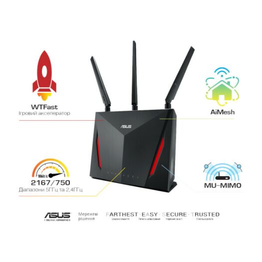Технологія NitroQAM ™ з підтримкою чотирьох потоків в діапазоні 5 ГГц Безпрецедентно високу швидкість передачі даних по бездротовій мережі - до 2917 Мбіт / с - забезпечує технологія NitroQAM ™ (1024-QAM) з підтримкою чотирьох потоків передачі даних (4x4) в діапазоні 5 ГГц. Плавне відтворення потокового відео формату 4K UHD і онлайн-ігри без найменших «лагів» - все це буде доступно для кожного користувача мережі Wi-Fi, організованої на базі даного маршрутизатора. потужна начинка RT-AC86U оснащується двоядерним процесором з тактовою частотою 1,8 ГГц, який володіє приголомшливою продуктивністю, а також чотирма антенами (трьома зовнішніми і однієї внутрішньої) для роботи в режимі чотирьох потоків передачі даних. Саме завдяки процесору маршрутизатор здатний передавати дані з настільки високою швидкістю - понад 110 МБ / с по інтерфейсу USB і до 1600 Мбіт / с по провідному інтерфейсу (WAN-LAN). Вбудована система мінімізації «лагів» Швидкість мережевої гри залежить від маршруту, яким відправляються пакети з її даними. Система Gamers Private Network® (GPN®) від компанії WTFast® служить для автоматичної оптимізації цього маршруту, що дозволяє значно знизити мережеві «лаги» і мінімізувати кількість втрачених пакетів. Користувач RT-AC86U може скористатися такою оптимізацією безкоштовно в цілому ряді онлайн-ігор для одного клієнтського пристрою на свій вибір. Адаптивна функція QoS За допомогою функції QoS користувач може задати пріоритет використання мережевого з'єднання, вибравши один з попередньо встановлених режимів. Наприклад, в режимі одиночної гри вся пропускна здатність маршрутизатора буде виділена під ігрове додаток, щоб мінімізувати затримки при передачі даних. Ця функція може сумісна з усіма популярними ігровими консолями, включаючи PlayStation®3, PlayStation®4, PS4 ™ Pro, PlayStation®Vita, Wii U, 3DS і Xbox One. Технологія MU-MIMO RT-AC86U з підтримкою багатокористувацької технології MIMO (MU-MIMO) працює на повній швидкості з декількома одночасно підключеними клієнтами, сумісними з цією технологією. Ця технологія вигідно відрізняється від традиційної однопользовательской технології MIMO, при якій окремим пристроїв часто доводиться чекати черги для передачі даних. Широка зона покриття Наявність в даному маршрутизаторі потужних антен і технології Range Boost означає велику зону покриття бездротової мережі Wi-Fi. Впевненою передачі радіосигналу також сприяє технологія «формування променя» AiRadar. Система безпеки AiProtection За безпеку від зовнішніх атак і збереження конфіденційних даних відповідає технологія AiProtection, розроблена спільно з компанією Trend Micro. Вона забезпечує захист всіх підключених до домашньої мережі цифрових пристроїв, в тому числі тих, які не володіють власними антивірусними системами (наприклад, пристрої класу «інтернет речей»). Інформаційна безпека Технологія AiProtection дозволяє відключати встановлений на комп'ютері антивірусне програмне забезпечення і брандмауер на час геймерской сесії, щоб вивільнити процесорні ресурси і уникнути випадкової блокування ігрових даних через надто суворих захисних налаштувань. Бездротова мережа Wi-Fi для великого будинку У більшості випадків RT-AC86U забезпечують широке покриття мережі Wi-Fi зі стабільним сигналом в кожному куточку будинку або квартири. Однак на це впливає безліч факторів, у тому числі розташування кімнат, матеріал стін і навіть меблі. Але навіть якщо в бездрото