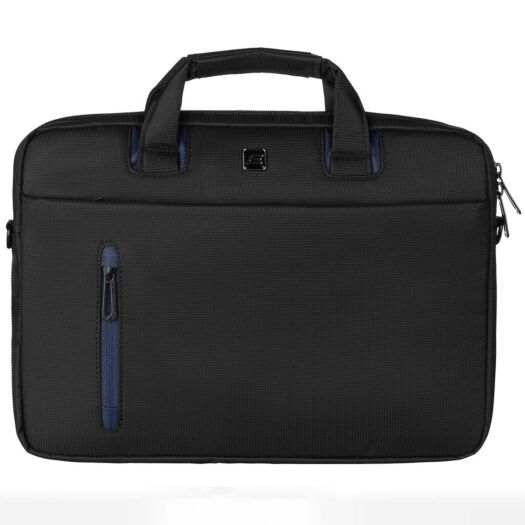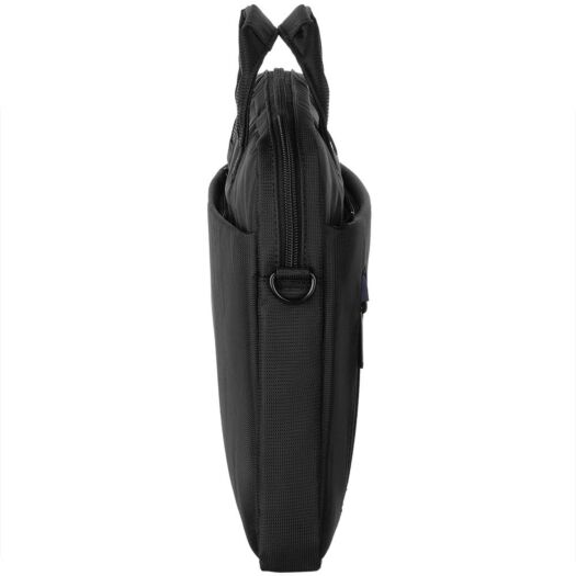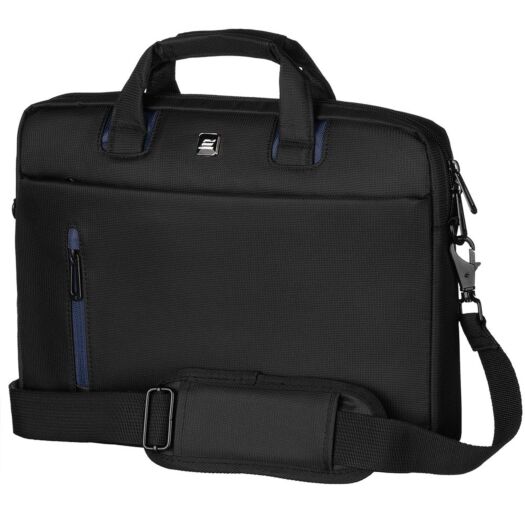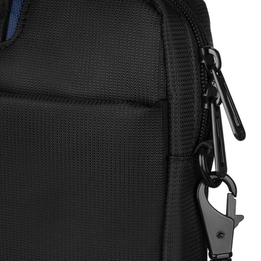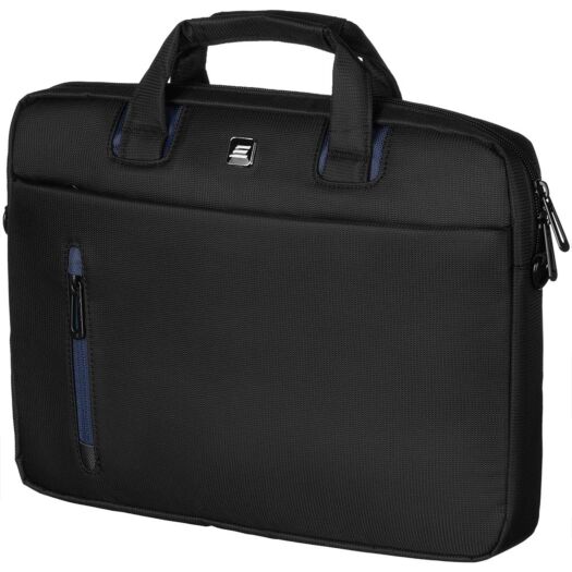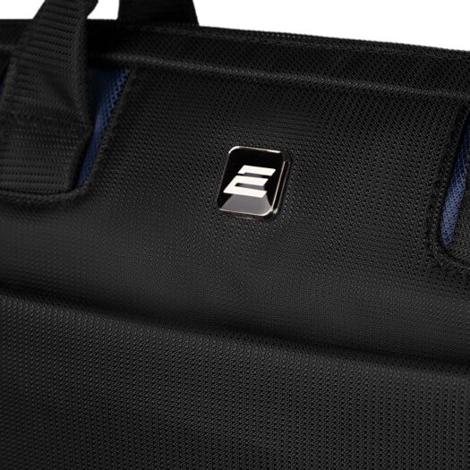 Сумка чорного кольору з синіми вставками для повсякденного використання. Виконана з водовідштовхуючого нейлону в комбінації з матеріалом дна і стінок, що амортизує поштовхи та удари.