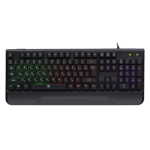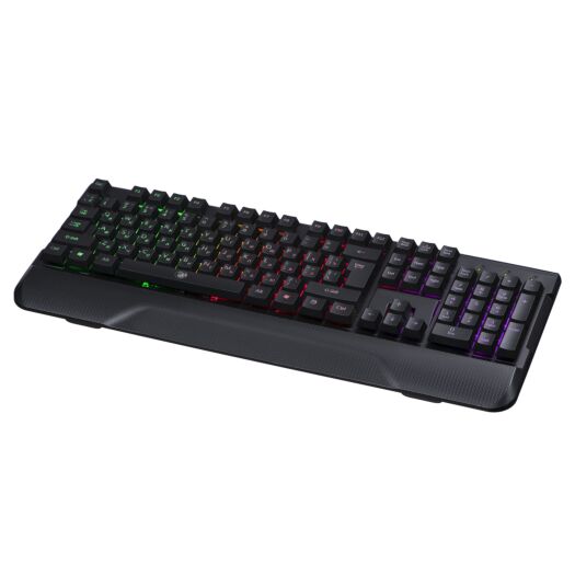 на зап’ястя, а кольорове LED підсвічування з лазерним гравіруванням додасть комфорту при роботі в умовах слабкого освітлення. Мембранний тип з тихим ходом клавіш подарує приємні відчуття від роботи за клавіатурою без зайвих докучливих звуків для оточуючих.
