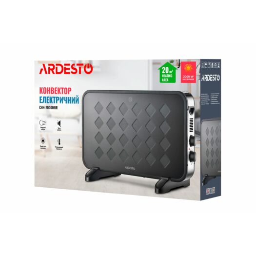 Електричний конвектор із механічним керуванням чорного кольору зі стильним візерунком, класом захисту IP20 і двома режимами потужності 1 250/2 000 Вт. Оснащений регульованим термостатом і розрахований на обігрів приміщення площею 20 м2 . Клас енергозахисту – перший. Є захист від перегріву та індикатор живлення нагрівального елемента. Конвектори ARDESTO підтримують два типи монтажу – настінний і підлоговий. Кронштейни та пасивні опори для підлогового встановлення